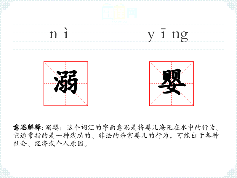 溺婴:这个词汇的字面意思是将婴儿淹死在水中的行为。它通常指的是一种残忍的、非法的杀害婴儿的行为,可能出于各种社会、经济或个人原因。