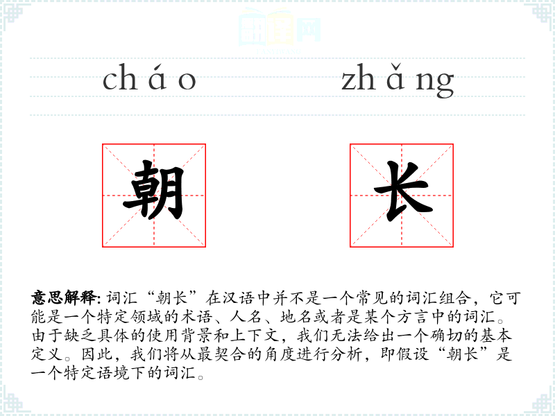 由于“朝长”不是一个标准汉语词汇,我们无法提供一个准确的字面意思和基本含义。它可能是一个合成词,由“朝”和“长”两个字组成,其中“朝”可以指早晨、朝代、方向等,“长”可以指长度、领导者、增长等。
