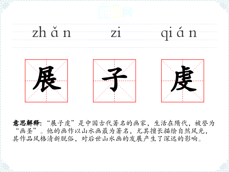 “展子虔”是**古代著名的画家,生活在隋代,被誉为“画圣”。他的画作以山水画最为著名,尤其擅长描绘自然风光,其作品风格清新脱俗,对后世山水画的发展产生了深远的影响。