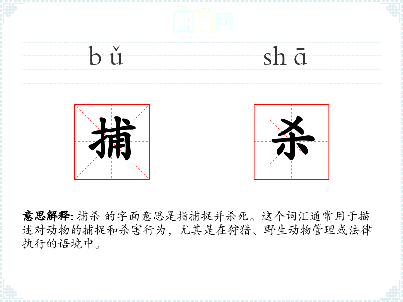 捕杀 的字面意思是指捕捉并杀死。这个词汇通常用于描述对动物的捕捉和杀害行为,尤其是在狩猎、野生动物管理或法律执行的语境中。