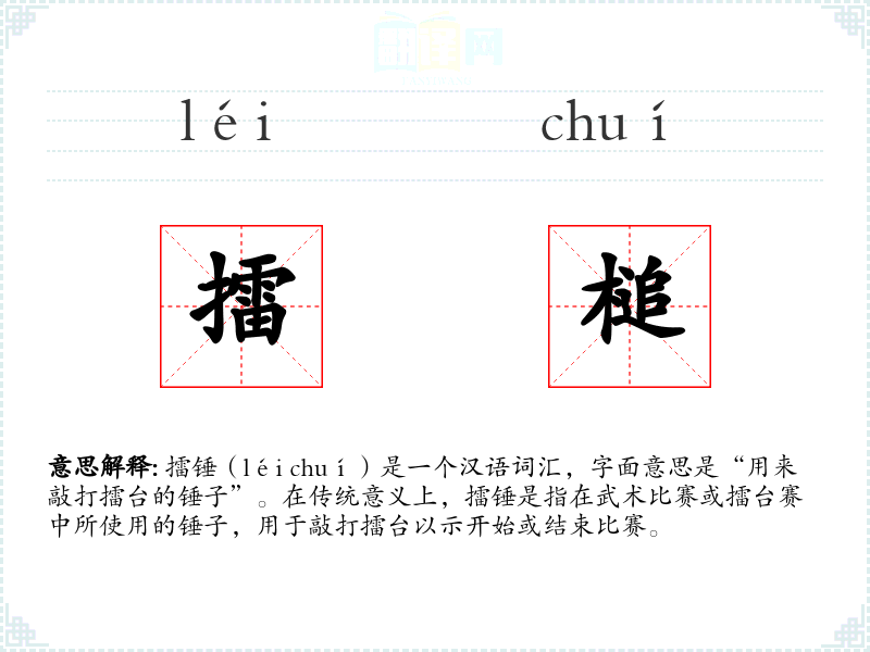 擂锤(léi chuí)是一个汉语词汇,字面意思是“用来敲打擂台的锤子”。在传统意义上,擂锤是指在武术比赛或擂台赛中所使用的锤子,用于敲打擂台以示开始或结束比赛。