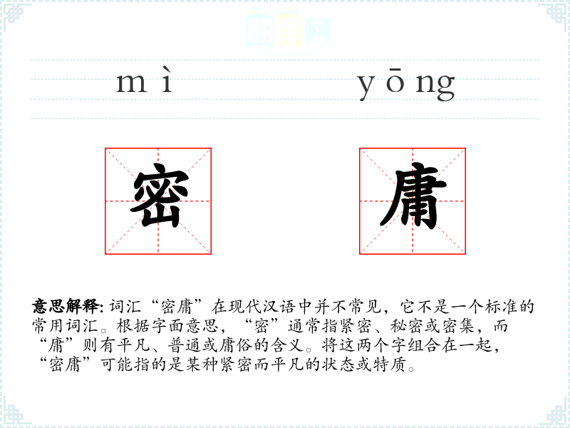 词汇“密庸”在现代汉语中并不常见,它不是一个标准的常用词汇。根据字面意思,“密”通常指紧密、秘密或密集,而“庸”则有平凡、普通或庸俗的含义。将这两个字组合在一起,“密庸”可能指的是某种紧密而平凡的状态或特质。