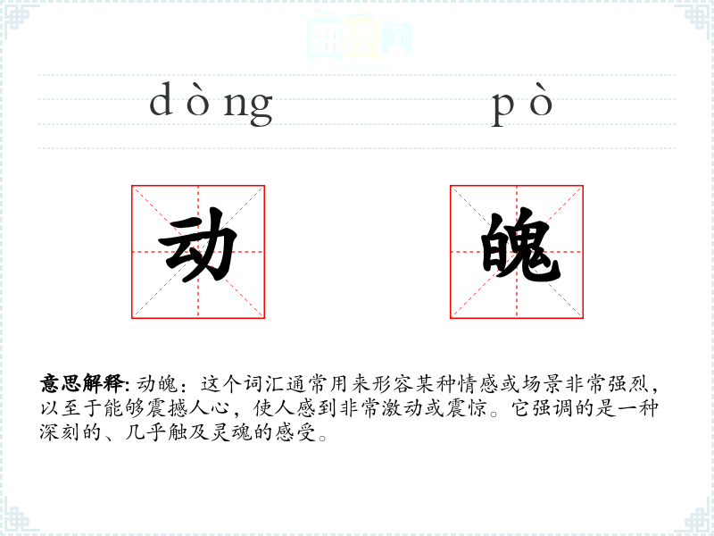 动魄:这个词汇通常用来形容某种情感或场景非常强烈,以至于能够震撼人心,使人感到非常激动或震惊。它强调的是一种深刻的、几乎触及灵魂的感受。