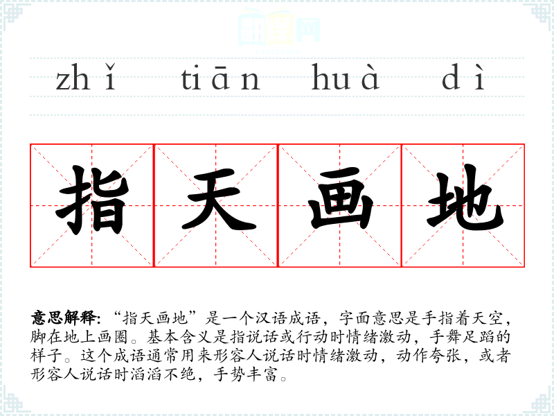“指天画地”是一个汉语成语,字面意思是手指着天空,脚在地上画圈。基本含义是指说话或行动时情绪激动,手舞足蹈的样子。这个成语通常用来形容人说话时情绪激动,动作夸张,或者形容人说话时滔滔不绝,手势丰富。
