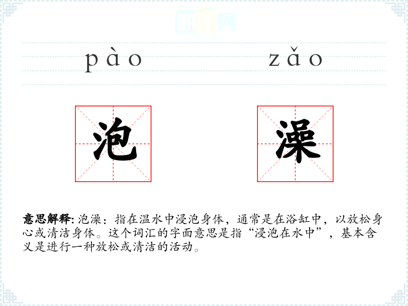 泡澡:指在温水中浸泡身体,通常是在浴缸中,以放松身心或清洁身体。这个词汇的字面意思是指“浸泡在水中”,基本含义是进行一种放松或清洁的活动。