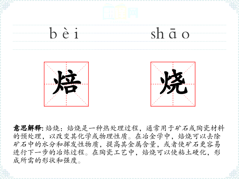 词源:焙烧一词源自中文,由“焙”和“烧”两个字组成。“焙”字古已有之,意为用微火烘烤;“烧”字则广泛用于表示加热或燃烧。