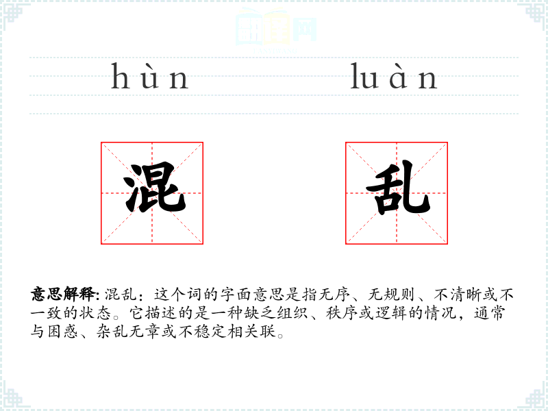 混乱:这个词的字面意思是指无序、无规则、不清晰或不一致的状态。它描述的是一种缺乏组织、秩序或逻辑的情况,通常与困惑、杂乱无章或不稳定相关联。