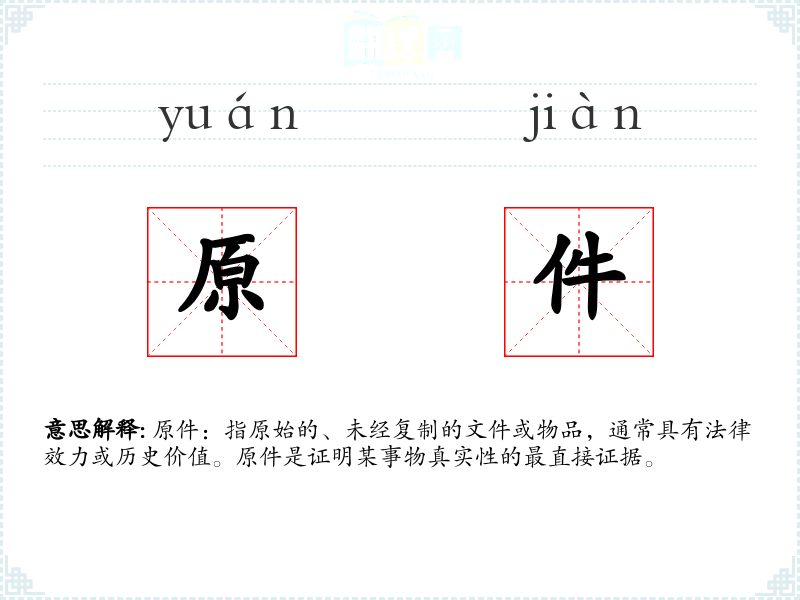 “原件”一词源于汉语,由“原”和“件”两个字组成。“原”指原始的、最初的,“件”指物品或文件。在古代汉语中,类似的表达可能使用“原物”或“原稿”,随着语言的发展,“原件”逐渐成为标准用语。