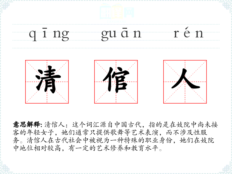 清倌人:这个词汇源自**古代,指的是在妓院中尚未接客的年轻女子,她们通常只提供歌舞等艺术表演,而不涉及性服务。清倌人在古代社会中被视为一种特殊的职业身份,她们在妓院中地位相对较高,有一定的艺术修养和教育水平。