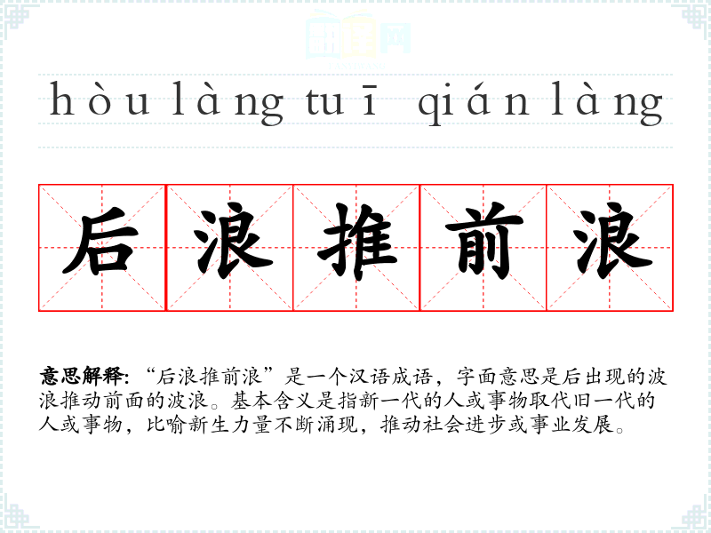 “后浪推前浪”是一个汉语成语,字面意思是后出现的波浪推动前面的波浪。基本含义是指新一代的人或事物取代旧一代的人或事物,比喻新生力量不断涌现,推动社会进步或事业发展。