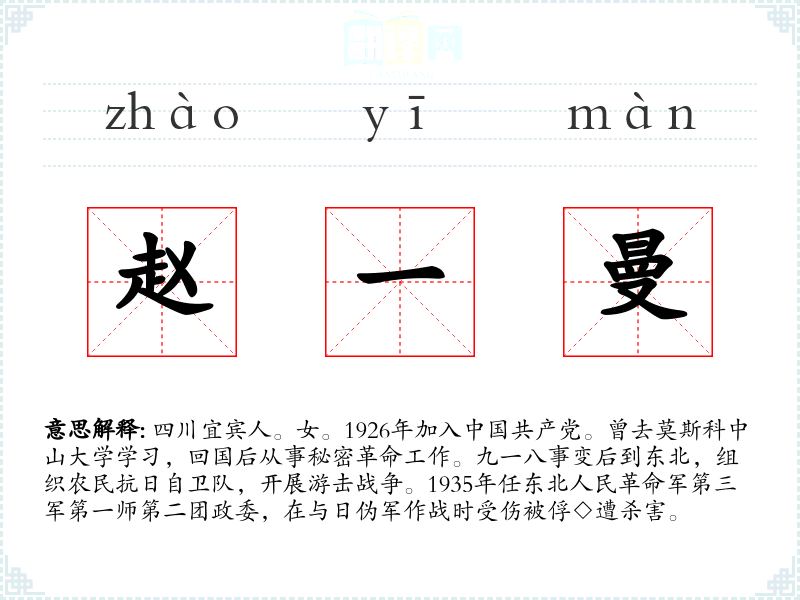 1.四川宜宾人。女。1926年加入中国共产党。曾去莫斯科中山大学学习,回国后从事秘密革命工作。九一八事变后到东北,组织农民抗日自卫队,开展游击战争。1935年任东北人民革命军第三军第一师第二团政委,在与日伪军作战时受伤被俘◇遭杀害。