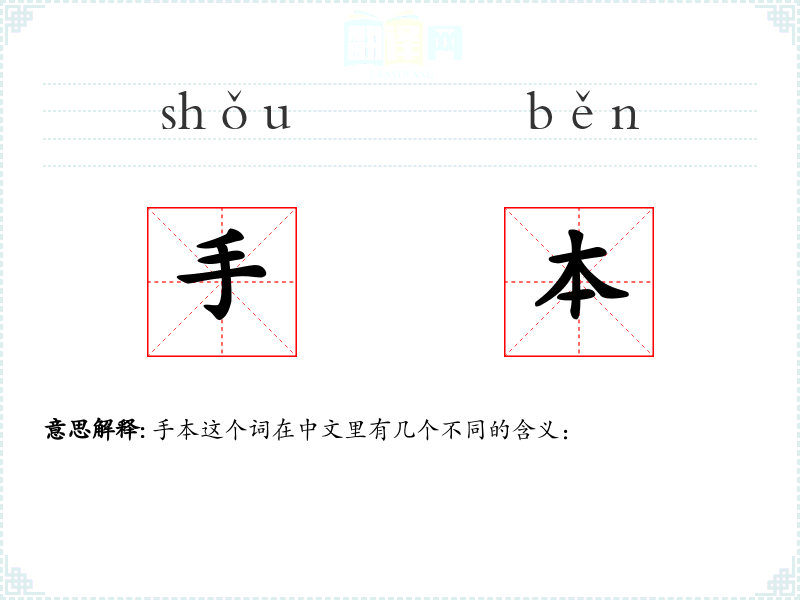 - 基本含义:在现代汉语中,手本常用来指代手写的稿件、笔记或者个人的学*资料。