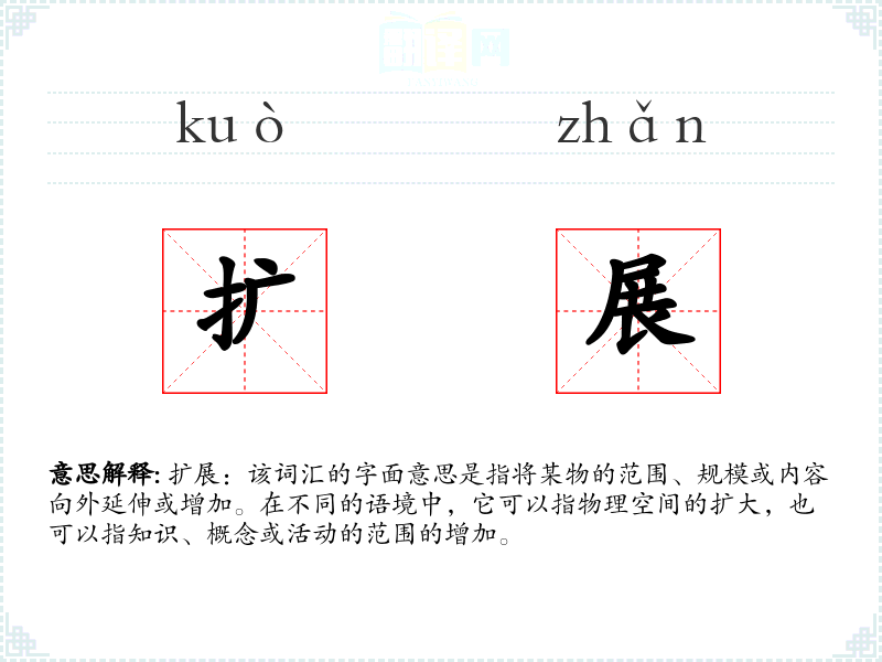 扩展:该词汇的字面意思是指将某物的范围、规模或内容向外延伸或增加。在不同的语境中,它可以指物理空间的扩大,也可以指知识、概念或活动的范围的增加。