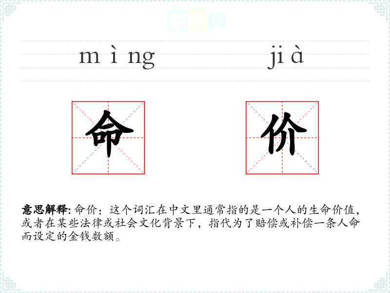 - 专业领域:在法律领域,特别是在涉及人身伤害或死亡的案件中,“命价”可能特指法院判决的赔偿金额。
