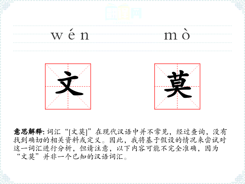 词汇“[文莫]”在现代汉语中并不常见,经过查询,没有找到确切的相关资料或定义。因此,我将基于假设的情况来尝试对这一词汇进行分析,但请注意,以下内容可能不完全准确,因为“文莫”并非一个已知的汉语词汇。