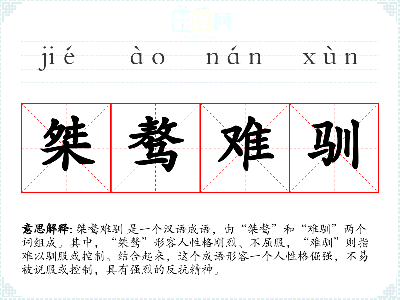 桀骜难驯 是一个汉语成语,由“桀骜”和“难驯”两个词组成。其中,“桀骜”形容人性格刚烈、不屈服,“难驯”则指难以驯服或控制。结合起来,这个成语形容一个人性格倔强,不易被说服或控制,具有强烈的反抗精神。