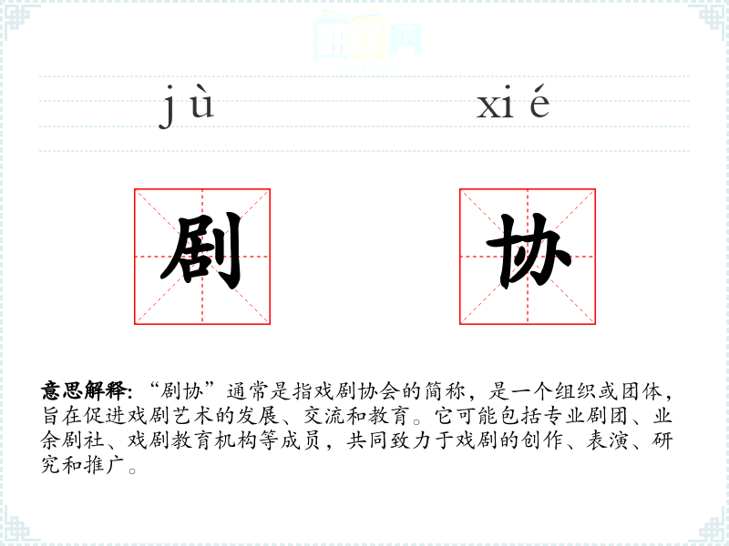 同义词:戏剧社、剧团、戏剧联盟 反义词:(由于“剧协”是一个特定领域的组织名称,通常没有直接的反义词)