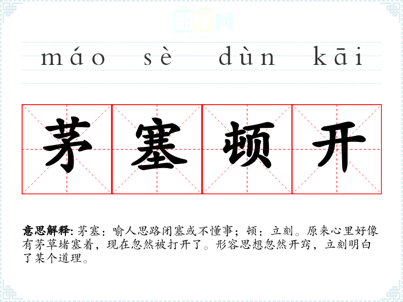 茅塞:喻人思路闭塞或不懂事;顿:立刻。原来心里好像有茅草堵塞着,现在忽然被打开了。形容思想忽然开窍,立刻明白了某个道理。