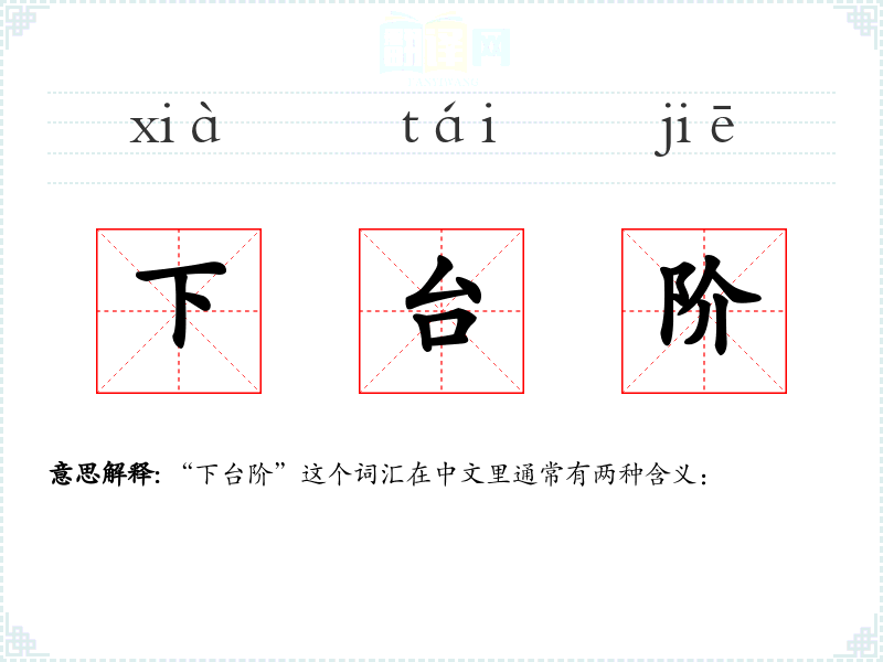 "下台阶"的意思解释、下台阶是什么意思由翻译网汉语词典查词提供。
