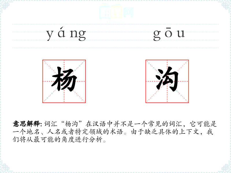 词汇“杨沟”在汉语中并不是一个常见的词汇,它可能是一个地名、人名或者特定领域的术语。由于缺乏具体的上下文,我们将从最可能的角度进行分析。