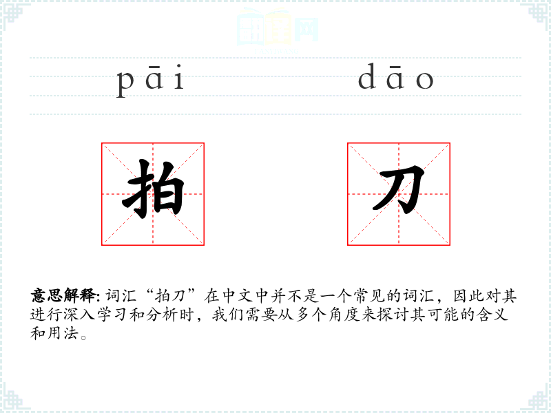 “拍刀”字面意思可能是指一种用于拍打的刀具,或者是某种特定的刀具操作方式。然而,由于这个词汇并不常见,其确切含义可能需要结合具体语境来确定。