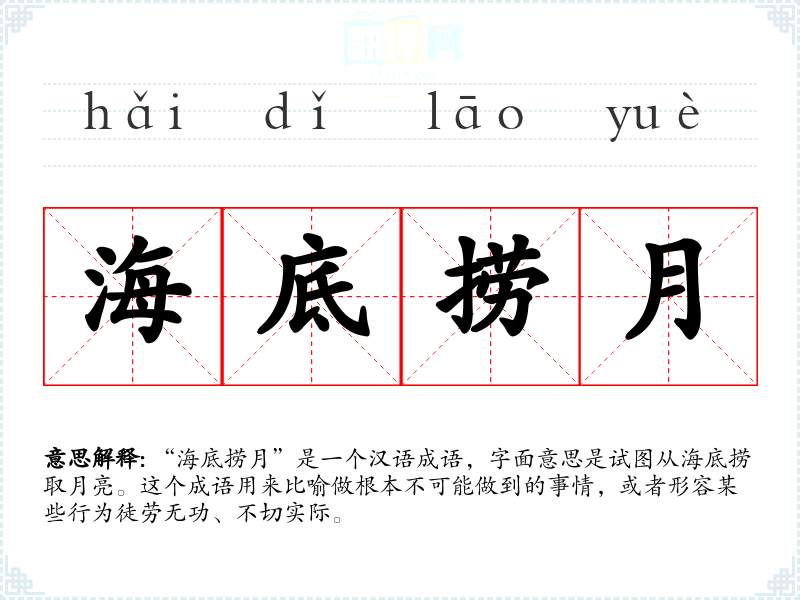 “海底捞月”是一个汉语成语,字面意思是试图从海底捞取月亮。这个成语用来比喻做根本不可能做到的事情,或者形容某些行为徒劳无功、不切实际。