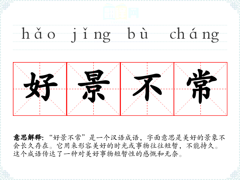 “好景不常”是一个汉语成语,字面意思是美好的景象不会长久存在。它用来形容美好的时光或事物往往短暂,不能持久。这个成语传达了一种对美好事物短暂性的感慨和无奈。