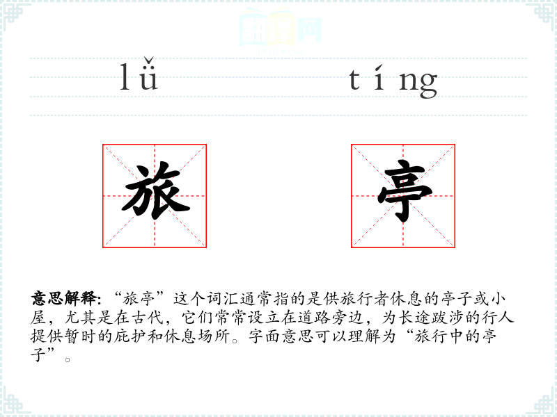 “旅亭”这个词汇通常指的是供旅行者休息的亭子或小屋,尤其是在古代,它们常常设立在道路旁边,为长途跋涉的行人提供暂时的庇护和休息场所。字面意思可以理解为“旅行中的亭子”。