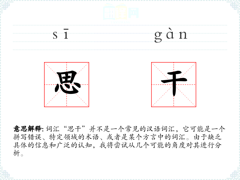 由于“思干”不是一个已知词汇,我们无法对其进行深入的理解和总结。如果“思干”是一个特定领域的术语或者是某个方言中的词汇,了解其具体的使用环境和背景将有助于更好地理解和分析这个词汇。