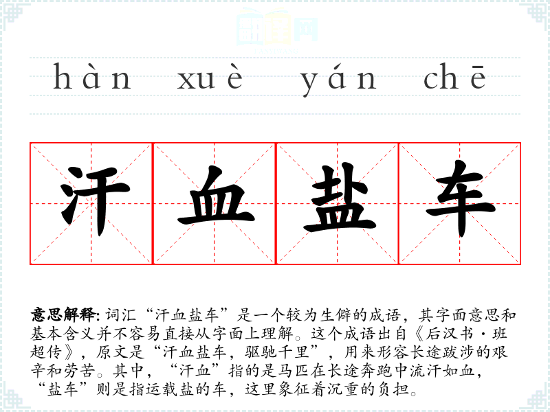 词汇“汗血盐车”是一个较为生僻的成语,其字面意思和基本含义并不容易直接从字面上理解。这个成语出自《后汉书·班超传》,原文是“汗血盐车,驱驰千里”,用来形容长途跋涉的艰辛和劳苦。其中,“汗血”指的是马匹在长途奔跑中流汗如血,“盐车”则是指运载盐的车,这里象征着沉重的负担。