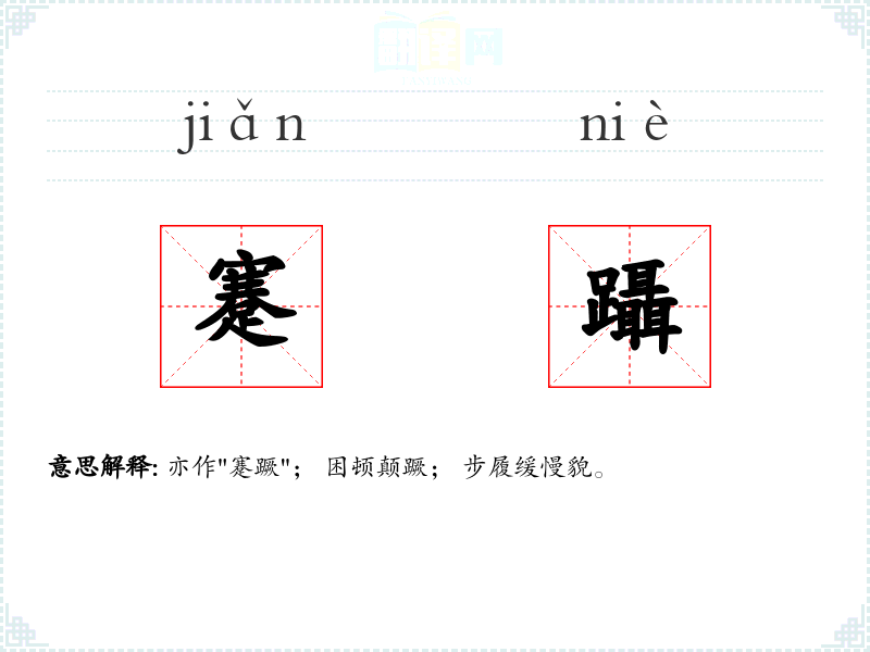 亦作"蹇蹶"; 困顿颠蹶; 步履缓慢貌。