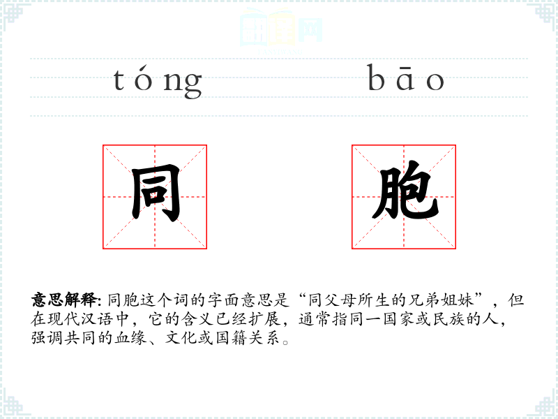 “同胞”这个词在汉语中承载了丰富的情感和文化内涵,它不仅是语言上的一个词汇,更是民族认同和团结精神的象征。在学*语言和表达时,理解和运用好“同胞”这个词,能够更好地传达我们的情感和思想。