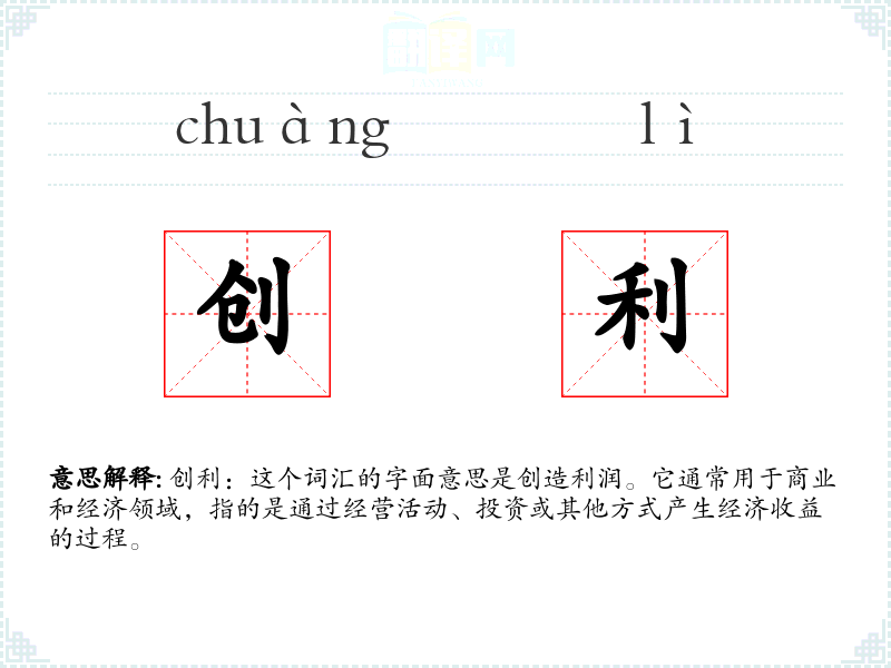 创利:这个词汇的字面意思是创造利润。它通常用于商业和经济领域,指的是通过经营活动、投资或其他方式产生经济收益的过程。