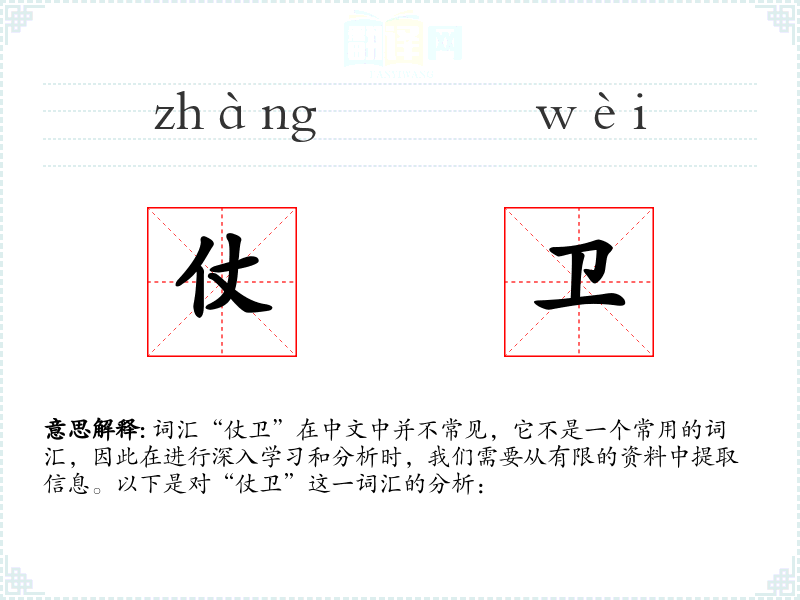 词汇“仗卫”在中文中并不常见,它不是一个常用的词汇,因此在进行深入学*和分析时,我们需要从有限的资料中提取信息。以下是对“仗卫”这一词汇的分析: