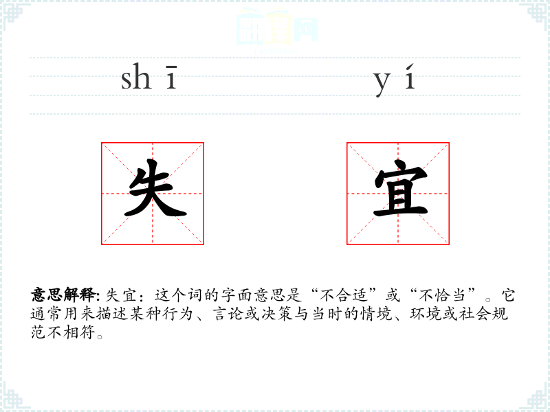 在英语中,“失宜”可以对应为“inappropriate”或“unsuitable”,这些词在不同文化中都有类似的含义和用法。