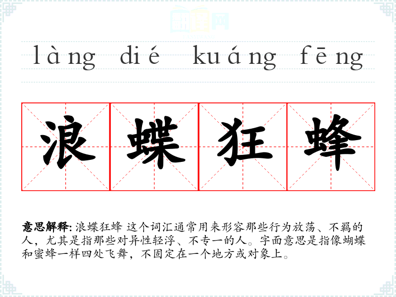 浪蝶狂蜂 这个词汇通常用来形容那些行为放荡、不羁的人,尤其是指那些对异性轻浮、不专一的人。字面意思是指像蝴蝶和蜜蜂一样四处飞舞,不固定在一个地方或对象上。
