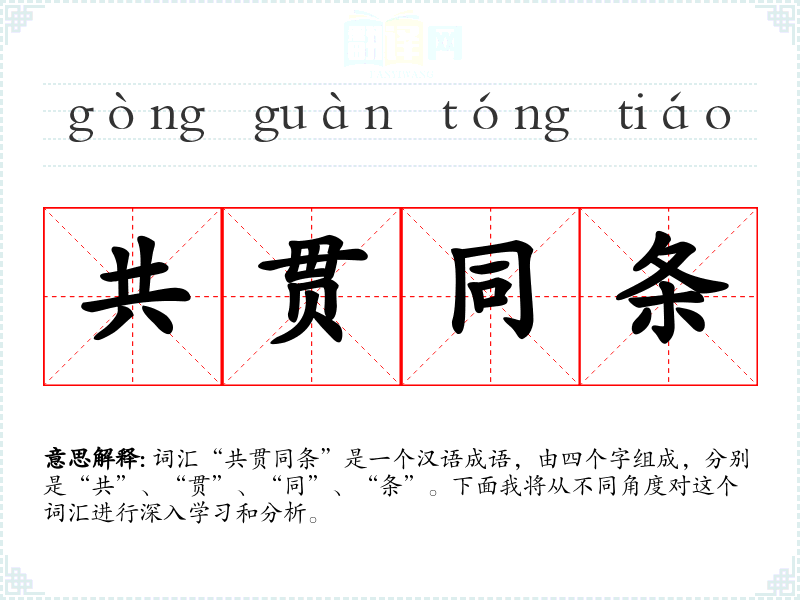 词汇“共贯同条”是一个汉语成语,由四个字组成,分别是“共”、“贯”、“同”、“条”。下面我将从不同角度对这个词汇进行深入学*和分析。