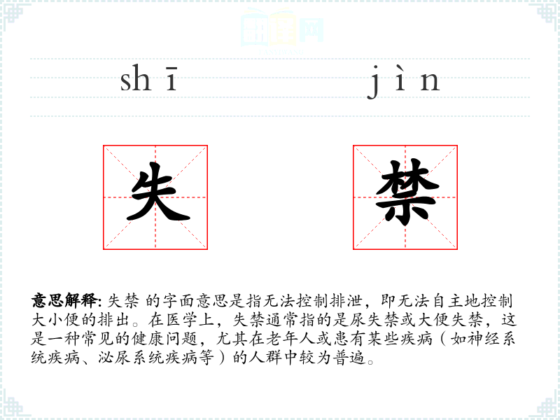 失禁 的字面意思是指无法控制排泄,即无法自主地控制大小便的排出。在医学上,失禁通常指的是尿失禁或大便失禁,这是一种常见的健康问题,尤其在老年人或患有某些疾病(如神经系统疾病、泌尿系统疾病等)的人群中较为普遍。