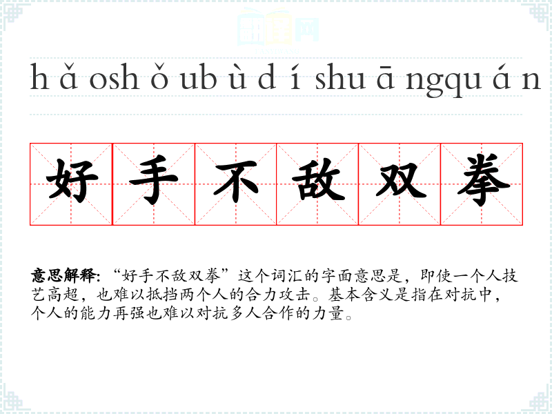“好手不敌双拳”这个词汇的字面意思是,即使一个人技艺高超,也难以抵挡两个人的合力攻击。基本含义是指在对抗中,个人的能力再强也难以对抗多人合作的力量。