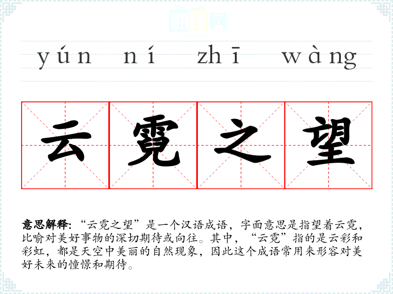 “云霓之望”这个成语的词源较为古典,源自**古代文学作品,如诗词中对自然美景的描绘。随着时间的推移,这个成语的含义逐渐固定为对美好事物的期待和向往。