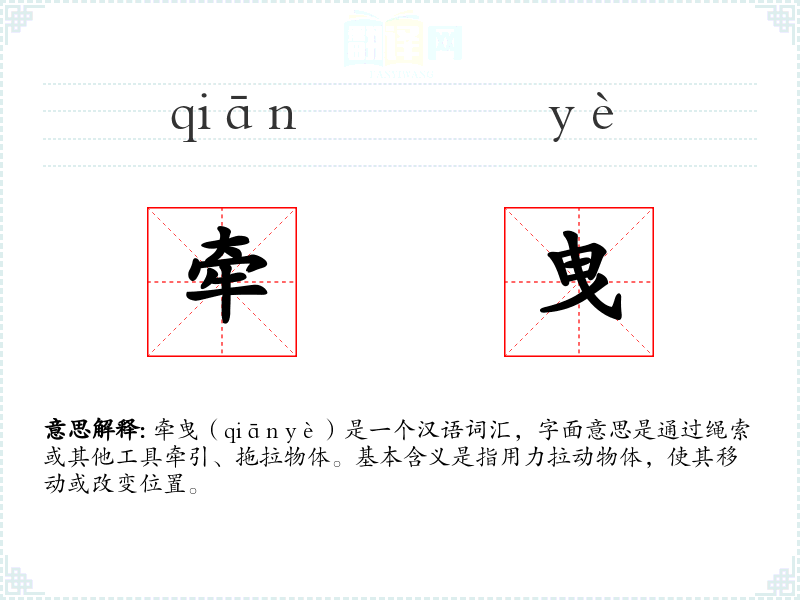 牵曳(qiān yè)是一个汉语词汇,字面意思是通过绳索或其他工具牵引、拖拉物体。基本含义是指用力拉动物体,使其移动或改变位置。