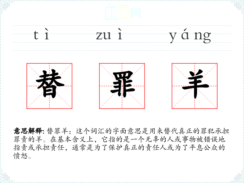 替罪羊:这个词汇的字面意思是用来替代真正的罪犯承担罪责的羊。在基本含义上,它指的是一个无辜的人或事物被错误地指责或承担责任,通常是为了保护真正的责任人或为了平息公众的愤怒。
