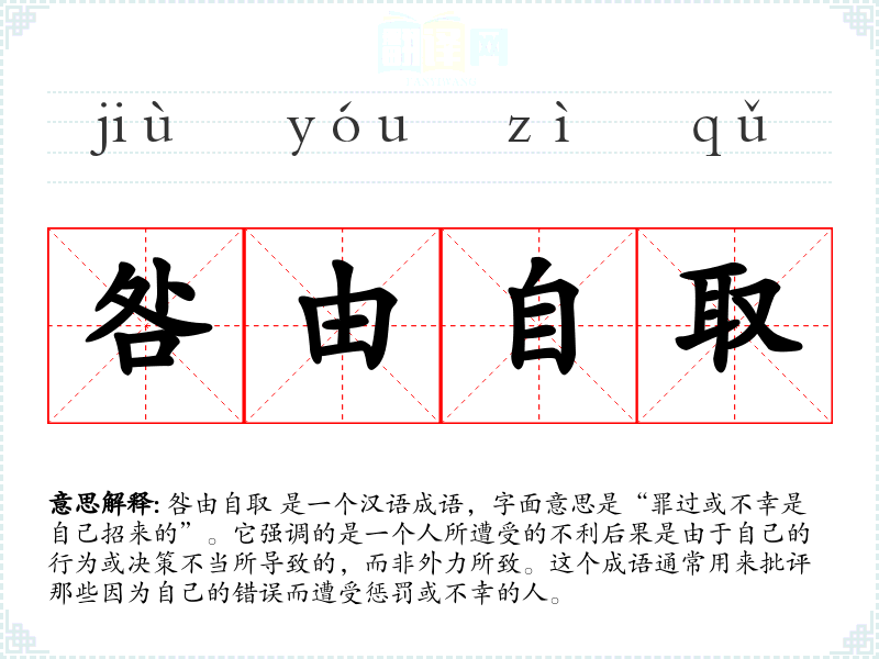 咎由自取 是一个汉语成语,字面意思是“罪过或不幸是自己招来的”。它强调的是一个人所遭受的不利后果是由于自己的行为或决策不当所导致的,而非外力所致。这个成语通常用来批评那些因为自己的错误而遭受惩罚或不幸的人。