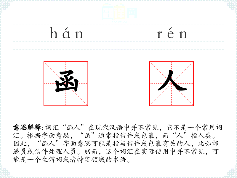“函”字在古代汉语中指信件或包裹,而“人”字指人类。这个词汇可能是由这两个字组合而成,用于指代与信件相关的人。