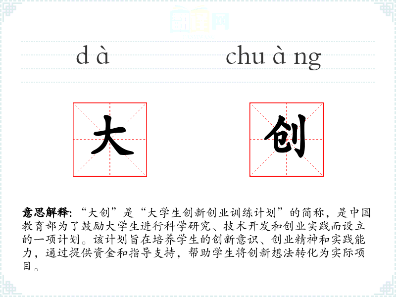“大创”一词是近年来随着**教育政策的推动而逐渐流行起来的。它源自“大学生创新创业训练计划”,随着该计划的普及和影响力的扩大,“大创”成为了一个常用的缩略语。
