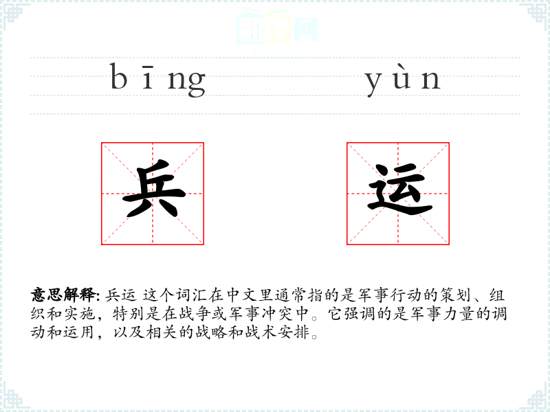 兵运 这个词汇在中文里通常指的是军事行动的策划、组织和实施,特别是在战争或军事冲突中。它强调的是军事力量的调动和运用,以及相关的战略和战术安排。