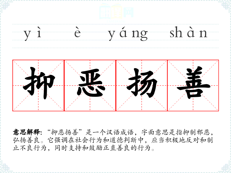 “抑恶扬善”是一个汉语成语,字面意思是指抑制邪恶,弘扬善良。它强调在社会行为和道德判断中,应当积极地反对和制止不良行为,同时支持和鼓励正直善良的行为。