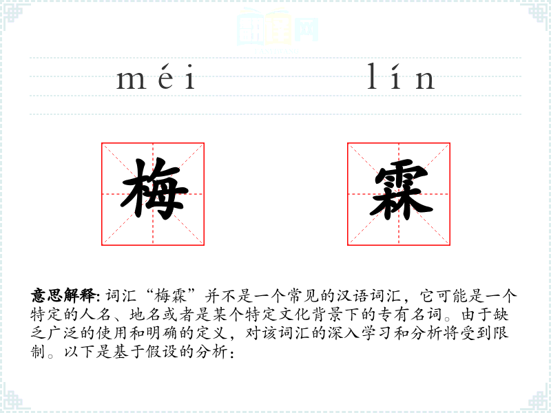 词汇“梅霖”并不是一个常见的汉语词汇,它可能是一个特定的人名、地名或者是某个特定文化背景下的专有名词。由于缺乏广泛的使用和明确的定义,对该词汇的深入学习和分析将受到限制。以下是基于假设的分析: