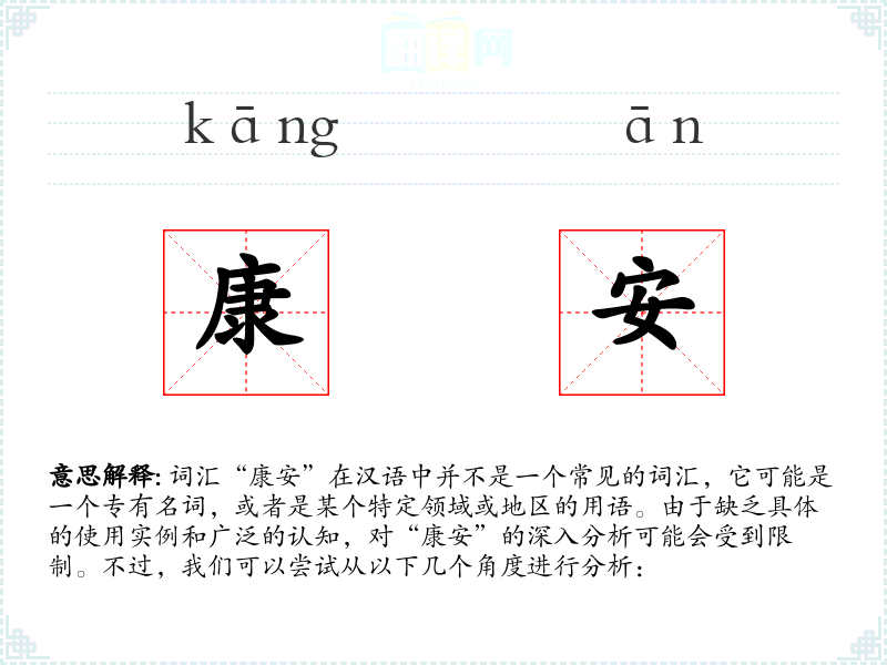 由于“康安”不是一个标准词汇,我们无法给出一个确切的基本定义。它可能是由“康”(健康、安乐)和“安”(安全、平静)两个字组合而成的,暗示着健康和安宁的状态。