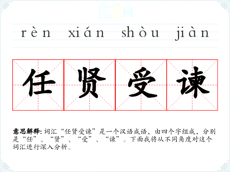 词汇“任贤受谏”是一个汉语成语,由四个字组成,分别是“任”、“贤”、“受”、“谏”。下面我将从不同角度对这个词汇进行深入分析。
